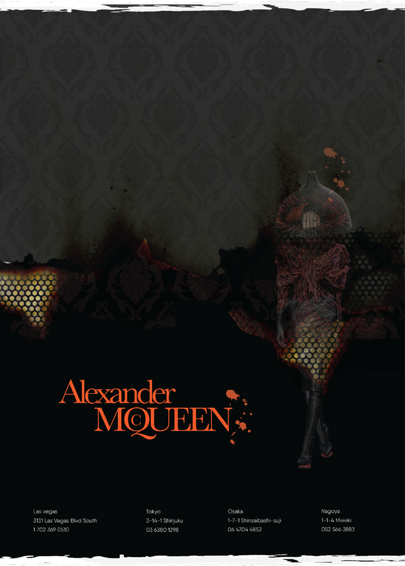 Alexander McQueen turned fashion into theatre — dark, beautiful, and technically relentless. This four-panel foldout was designed as a collectible keepsake for Alexander McQueen flagship locations, honoring the Met's landmark Savage Beauty exhibition. Photography, acrylic paint textures, vector elements, and layered typography fold into a single piece — dense with detail, built to reward a closer look. The complexity of the format mirrors the designer it celebrates.