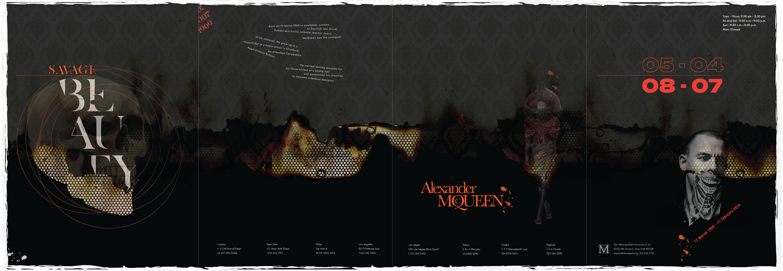 Alexander McQueen turned fashion into theatre — dark, beautiful, and technically relentless. This four-panel foldout was designed as a collectible keepsake for Alexander McQueen flagship locations, honoring the Met's landmark Savage Beauty exhibition. Photography, acrylic paint textures, vector elements, and layered typography fold into a single piece — dense with detail, built to reward a closer look. The complexity of the format mirrors the designer it celebrates.